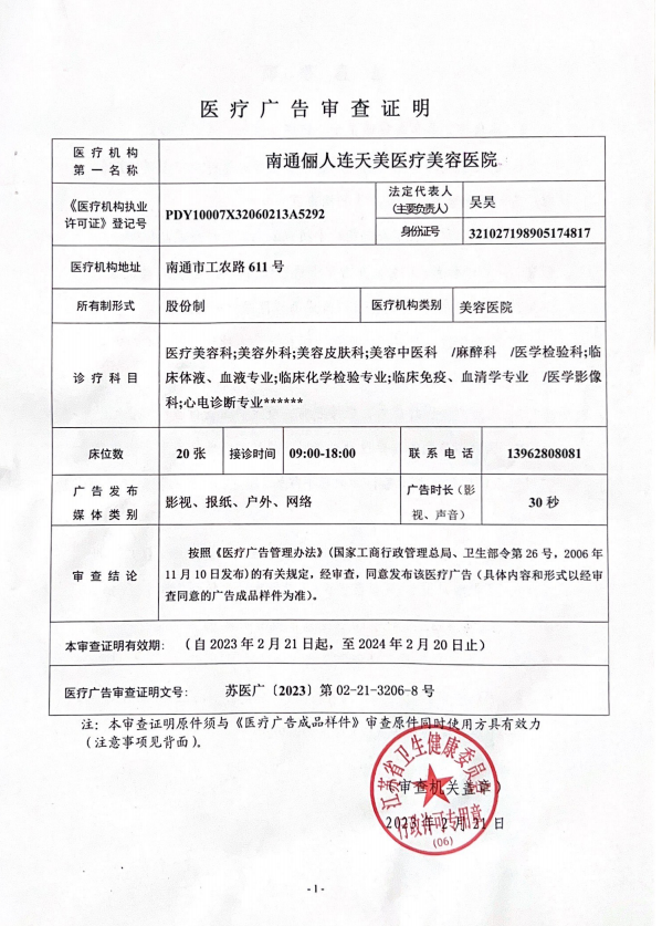 南通俪人连天美医疗美容医院是与著名的医疗美容集团合作建立的医院,医院提供高品质的医疗美容服务。2008年,南通俪人连天美医疗美容医院落户南通,成为由南通卫生局审批的专业医疗美容医院。南通俪人连天美医疗美容医院,特别设有专业的整形美容科、皮肤美容科和微创美容科三大科室,致力于为广大求美者提供全方位的医疗美容服务。南通俪人连天美医疗美容医院为求美者建立个人终生美丽档案,一对一进行细致服务。 11年来,南通俪人连天美医疗美容医院,不断引进先进设备,不断完善医美技术,一批优秀、专业而稳定的医生团队,为无数求美者铸就美丽梦想。